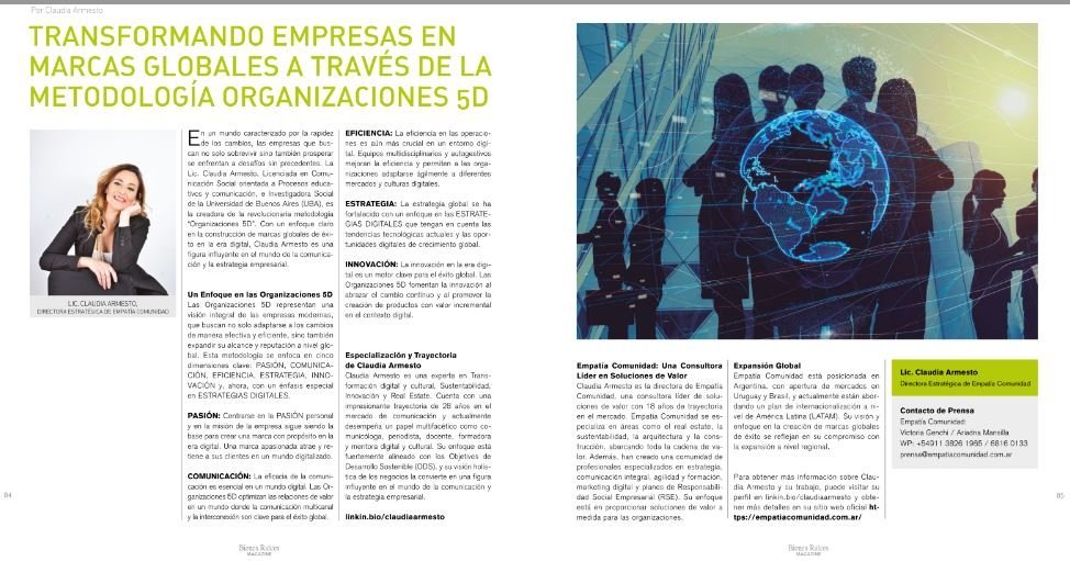 En un mundo caracterizado por la rapidez de los cambios, las empresas que buscan no solo sobrevivir sino también prosperar se enfrentan a desafíos sin precedentes. La Lic. Claudia Armesto, Licenciada en Comunicación Social orientada a Procesos educativos y comunicación, e Investigadora Social de la Universidad de Buenos Aires (UBA), es la creadora de la revolucionaria metodología «Organizaciones 5D»