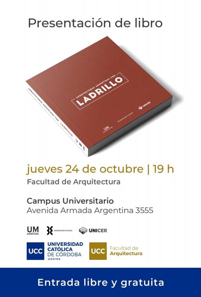 El próximo 24 de octubre a las 19 hs en el salón de actos de la Facultad de Arquitectura en la Universidad Católica de Córdoba (UCC), el Grupo UNICER y la editorial Bisman Ediciones junto a la Universidad de Morón (UM), presentarán “Arquitecturas argentinas con ladrillo”, un libro que en más de 360 páginas realiza un recorrido de las 38 obras construidas con la utilización del ladrillo como materia constructiva para hacer arquitectura.